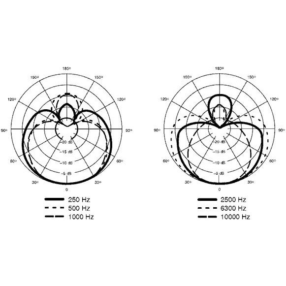- Диаграмма направленности капсюля: суперкардиоидная, с круговой симметрией относительно оси микрофона;